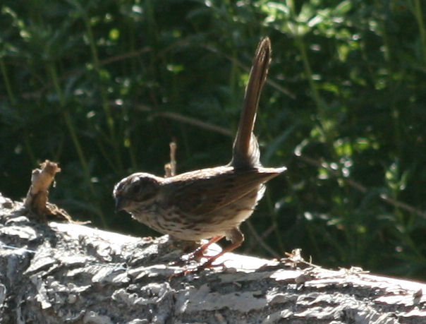| This small bird didn't give me time for more than these two quick shots. The experts at the Colorado Birder web site said this is a Song Sparrow. The tail looked too long, but I guess holding it vertical made it look longer than a Song Sparrow would have. Found at the Fountain Creek Nature Center on 20 July 2011. |