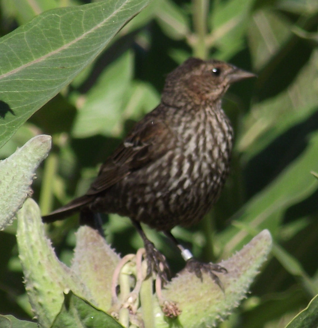 | This is another immature female Red-Winged Blackbird, found on 26 July 2010 at the Fountain Creek Nature Center, in a patch of Milkweed plants. This one has been banded, and why would anyone band a Red-Winged blackbird? |