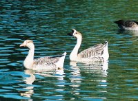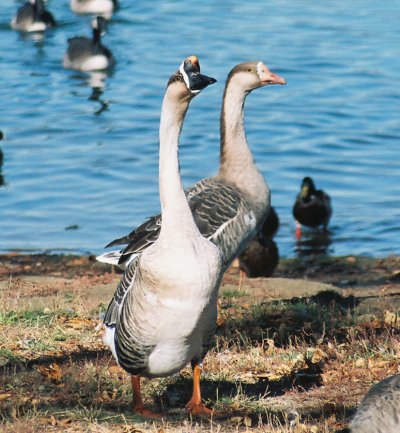| These are Chinese Geese (Anser cygnoides), which is a domesticated and selectively bred version of the Swan Goose. They were found on Prospect Lake, Colorado Springs, on 15 October 2007. The male is the one with the lump on top of his head. The original version of the Swan Goose is smaller, does not have the pronounced lump on the head, and is now considered endangered in the wild. | ![]()