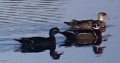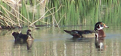 The second picture is of a female wood duck on the left, a male in the center, and the one on the far side may be a young one that does not have an adult's colors yet. This picture was taken on 26 September 2009 at the Fountain Creek Nature Center. They were far off, so the picture is not great. The third picture was taken on 1 June 2010 at the Fountain Creek Nature Center, and shows a male and female Wood Duck.