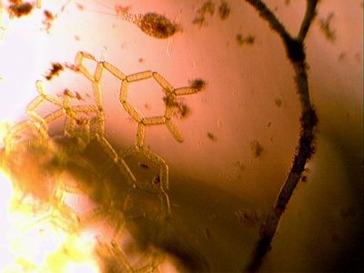 Click here or here for videos of the cyclops. The second picture was taken of a cyclops found on 22 April 2009 in a small pond in Elbert county, Colorado. The third picture is another individual, same place and time, and shows good detail of the tail. They have five pair of swimming legs, but only the first picture shows them, but not clearly. They swim with a jerky motion, quite rapidly. The last picture has a cyclops at the top. The structure in the middle of the picture is a form of green algae known as a water net. More information can be found in the Plantae section of this collection.